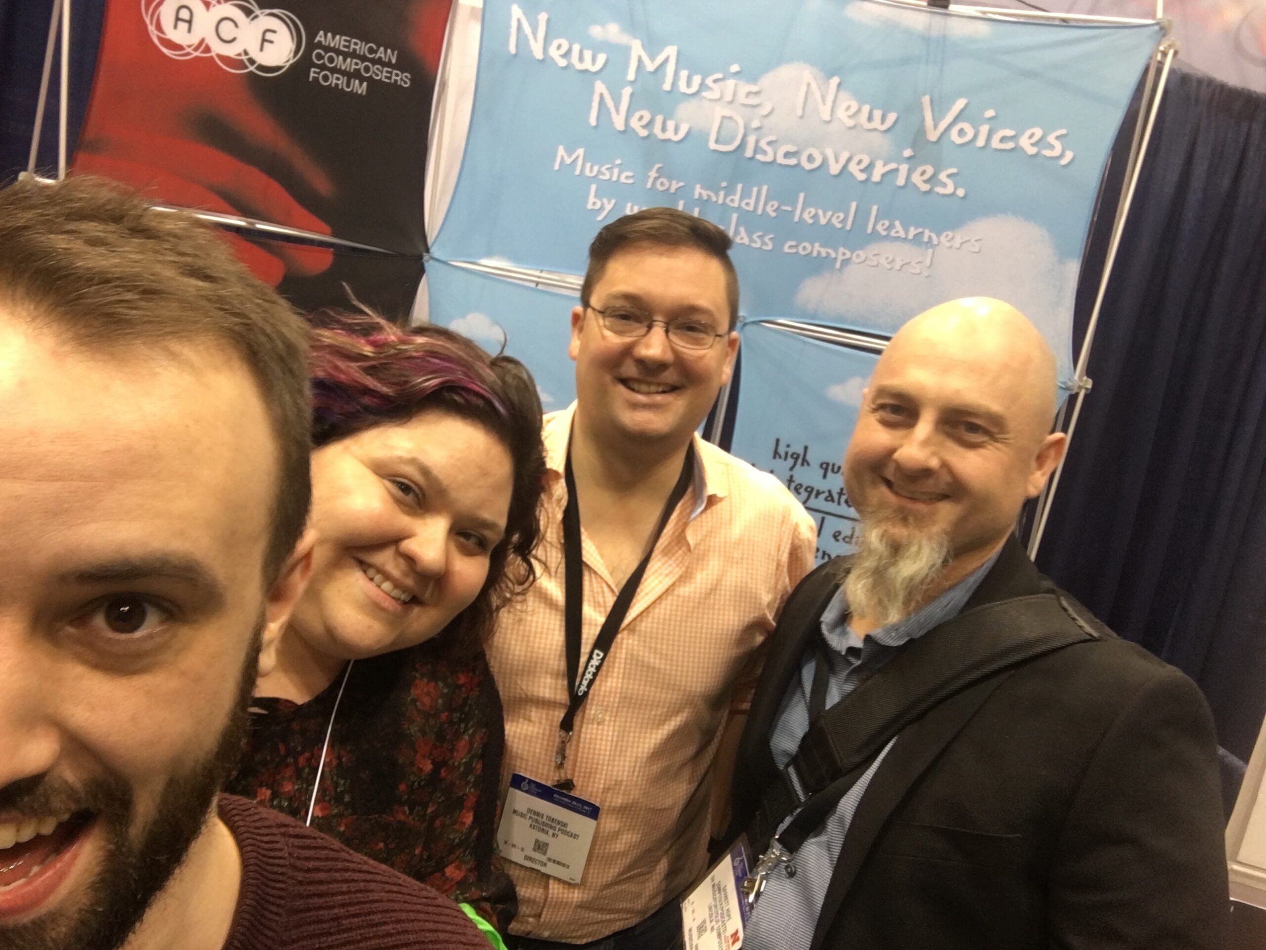 There were many engaging conversations around the new piece by Michael Gandolfi called “Steps Ahead,” new updates in our curricular offerings, and making connections with composers in all stages of their artistic life. Along with our time in the exhibit hall, we also reconnected with Hal Leonard, MakeMusic Inc, and Noteflight, our wonderful educational program partners. And in keeping with tradition, we met with BandQuest composer and Series Editor Thomas C. Duffy and BandQuest advisor Frank Battisti to talk about the program’s trajectory. It was the perfect way to end 2017 and talk about the future of new band music!