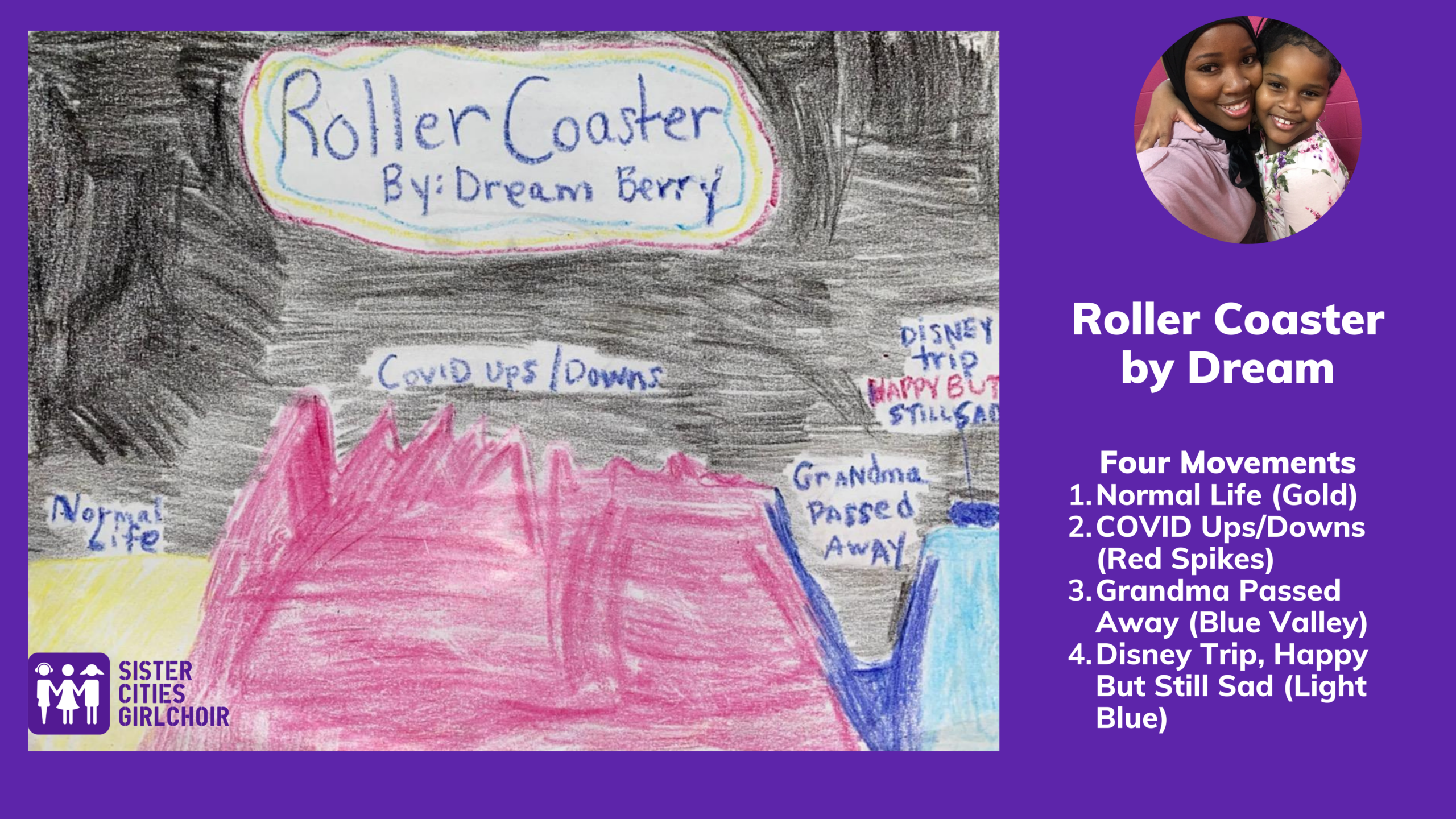 Dream, an 8-year-old composer, created a score, Rollercoaster, that told the story of her ups and downs during COVID. She clashed the colors of pink and red in a near literal representation of a rollercoaster that trombonist Robyn Smith interpreted. Dream remarked on hearing her piece for the first time, “I felt put on the spot [listening to my composition], but I was happy to get my feelings out.”