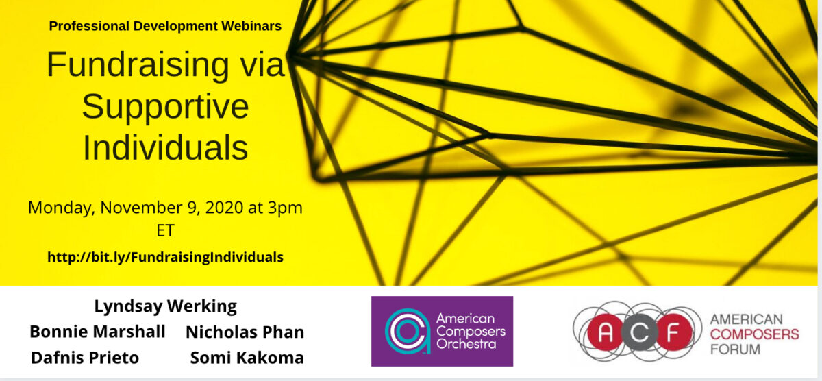 Learn how to raise funds for your next project by leveraging the support of generous individuals. American Composers Orchestra Acting President and Director of Development Lyndsay Werking leads a panel of artists and administrators fluent in grassroots fundraising.