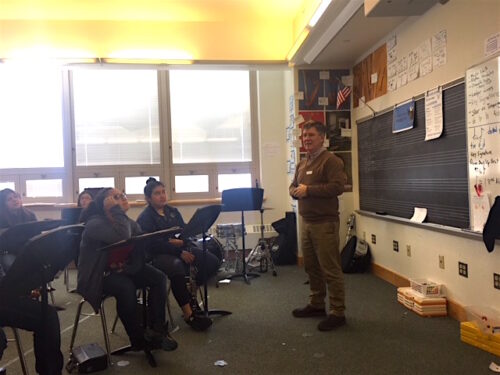 This winter, BandQuest series editor and composer Thomas C. Duffy met with the 7-8th grade band and director Daniel Kinsman at Fair Haven Middle School in Connecticut to jump-start the creation of a brand-new work for the students. The piece is called Scalin’ and Wailin,’ and it’s unlike anything else the ensemble has ever performed. This new piece employs differentiated learning where musicians and students can play this piece no matter what stage of technical facility they occupy. Divided into color groupings, beginners can play one color family right alongside more advanced musicians playing a different color family. And, the advanced partnering ensemble for the world premiere will be none other than the Yale Concert Band conducted by Duffy.